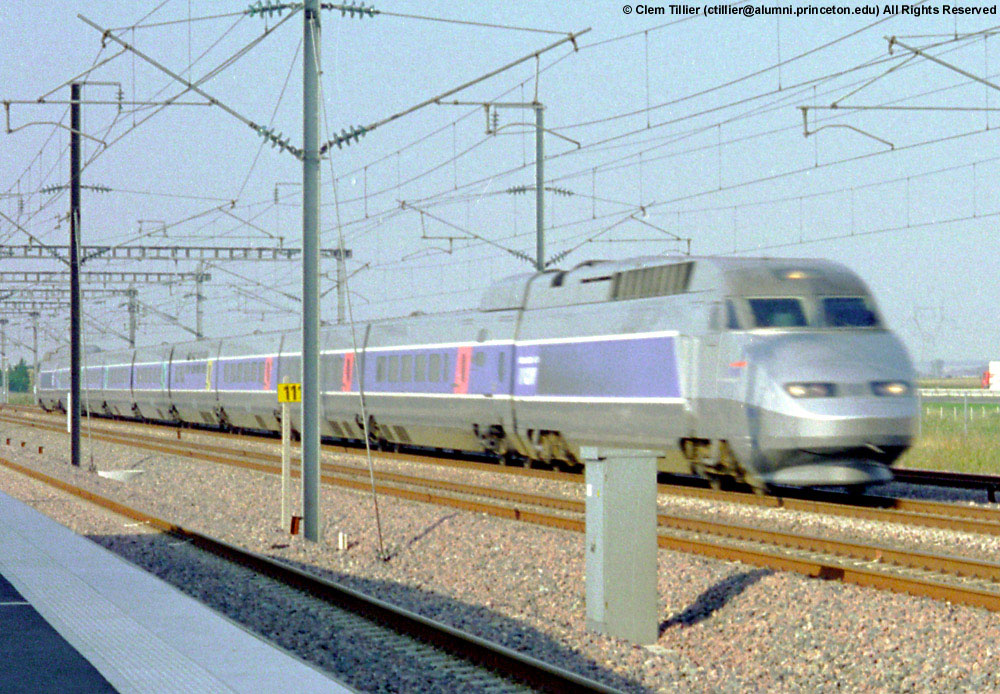 A Paris-bound Réseau trainset zooming through the TGV Haute-Picardie station at 300 km/h, on September 03, 1996. This photo is available as a high-quality 3000 x 2000 pixel scan of the original negative. Photo by Clem Tillier (ctillier@alumni.princeton.edu) |