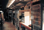 At left, the relative tilt of the non-tilting power car (left in photo) compared to the full 6.3 degree tilt of the first trailer. At right, the interior of trailer R1 fitted as a laboratory. Both photos copyright Yann Nottara, 1998.